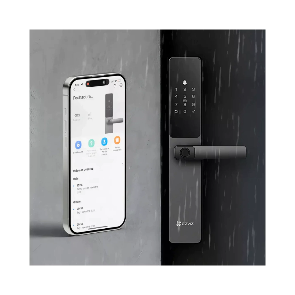 A Fechadura Inteligente EZVIZ DL05 oferece segurança, tecnologia e praticidade em um único dispositivo. Com design moderno em liga de alumínio e proteção IP65 no painel frontal, ela permite múltiplas formas de acesso, incluindo impressão digital, senha, cartão, aplicativo EZVIZ, Bluetooth, Wi-Fi e chave mecânica.